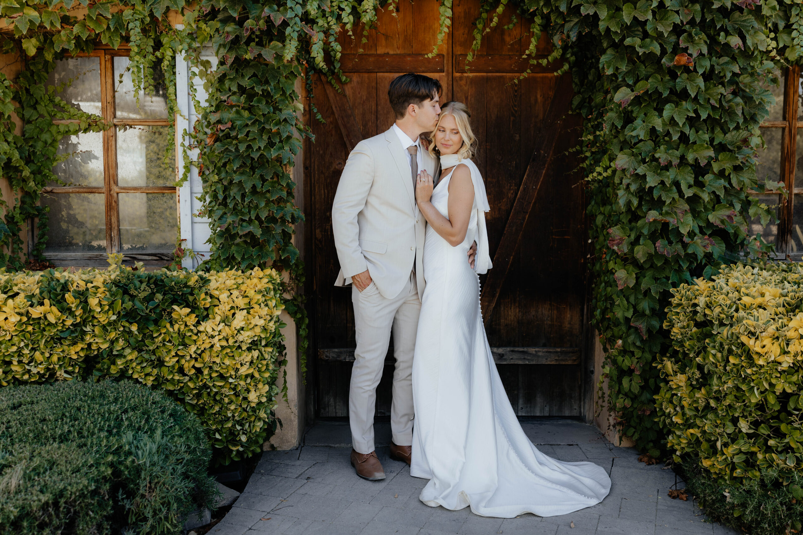The day started in the afternoon, and the sun was just beginning to warm the grounds. Milagro has that earthy vineyard smell that instantly feels calm and inviting. Emma’s look was simple and timeless — a flowy gown paired with baby blue heels as her “something blue.” Chris wore a classic tan suit that fit perfectly with the warm, golden tones seen at Milagro. Every detail felt natural and blended right in with the beauty of the landscape.